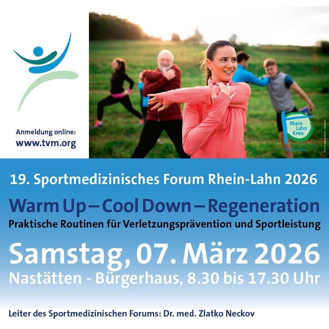 Ab sofort können sich Interessierte für das 19. Sportmedizinische Forum am Samstag, 7. März 2026, in Nastätten anmelden. Dabei handelt es sich um eine Fortbildungsveranstaltung für Physiotherapeutinnen und Physiotherapeuten, Übungsleiterinnen und Übungsleiter, Sportlehrerinnen und Sportlehrer, Sportgruppen, Reha-Einrichtungen, Pflegeberufe, Arzthelferinnen und Arzthelfer sowie Ärztinnen und Ärzte – mit Anerkennung der Teilnahme zur Lizenzverlängerung im Sport und Zertifizierung bei der Ärztekammer.