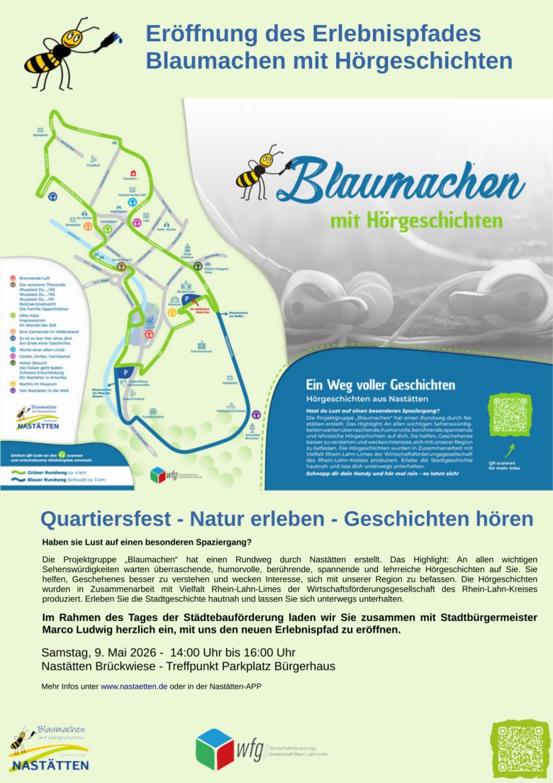 Die Projektgruppe „Blaumachen“ hat einen Rundweg durch Nastätten erstellt. Das Highlight: An allen wichtigen Sehenswürdigkeiten warten überraschende, humorvolle, berührende, spannende und lehrreiche Hörgeschichten auf Sie. Sie helfen, Geschehenes besser zu verstehen und wecken Interesse, sich mit unserer Region zu befassen. Die Hörgeschichten wurden in Zusammenarbeit mit Vielfalt Rhein-Lahn-Limes der Wirtschaftsförderungsgesellschaft des Rhein-Lahn-Kreises produziert. Erleben Sie die Stadtgeschichte hautnah und lassen Sie sich unterwegs unterhalten.