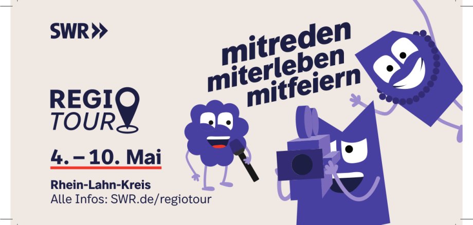 Der SWR kommt vom 4. bis 10. Mai 2026 in den Rhein-Lahn-Kreis und zeigt die Vielfältigkeit dieser Region in seinen Programmen in Fernsehen, Hörfunk und Online. Bei den Events stehen Kultur und Information, Unterhaltung und Austausch für alle Generationen im Mittelpunkt. Alle Eintritte sind frei (zum Teil mit Anmeldung). Mitmachen und Dialog sind ausdrücklich erwünscht!