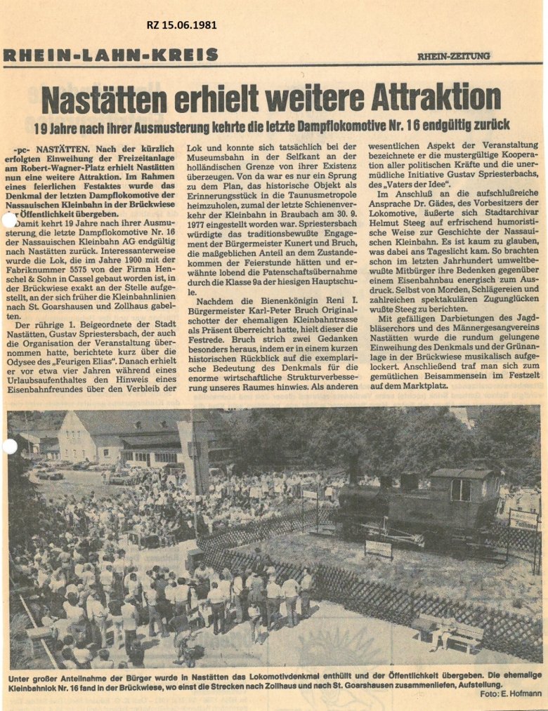 Im Juni 1981 wurde das Denkmal feierlich der Öffentlichkeit übergeben. Die letzte Dampflokomotive der Nassauischen Kleinbahn, Lok Nr. 16, wurde an der Brückwiese aufgestellt – an jener Stelle, an der sich früher die Strecken nach St. Goarshausen und Zollhaus trennten. 19 Jahre nach ihrer Ausmusterung kehrte sie damit endgültig nach Nastätten zurück.