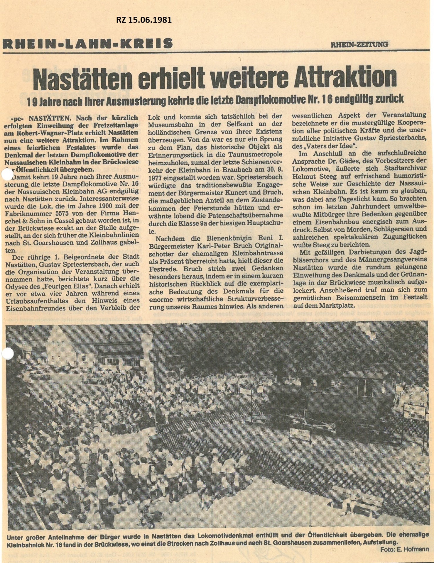 1981 kehrte die letzte Dampflok Nr.16 nach Nastätten zurück