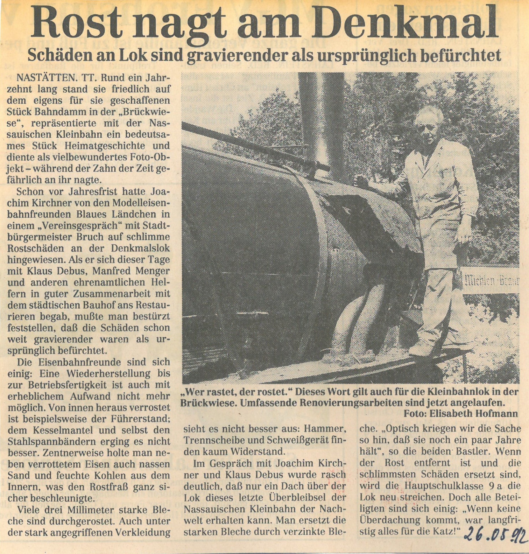 In einem Gespräch mit Stadtbürgermeister Karl Peter Bruch in den 1990er Jahren wurde bereits auf schlimme Rostschäden an der Lok hingewiesen. Die Eisenbahnfreunde waren sich einig, eine Wiederherstellung bis zur Betriebsfertigkeit, ist auch mit erheblichem Aufwand nicht mehr möglich.