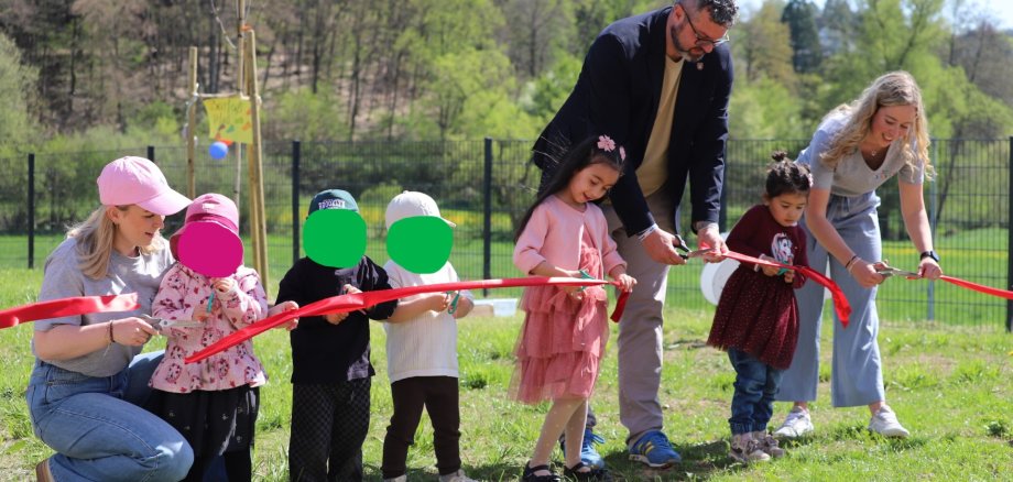 Nach einigen organisatorischen Hinweisen folgte schließlich der Höhepunkt der Veranstaltung: Die offizielle Eröffnung des Außengeländes. Marco Ludwig, Kathrin Bonn, Antonia Bohrmann (stellv. Leitung) sowie sechs Kinder – jeweils zwei aus jeder Gruppe, die zuvor durch eine Kinderwahl ernannt wurden – durchschnitten gemeinsam das rote Band.