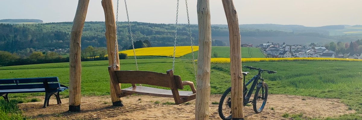 Oben angekommen lohnt sich ein erneuter Stopp an der, vom Dorftheater Welterod gespendeten Baumelbank.