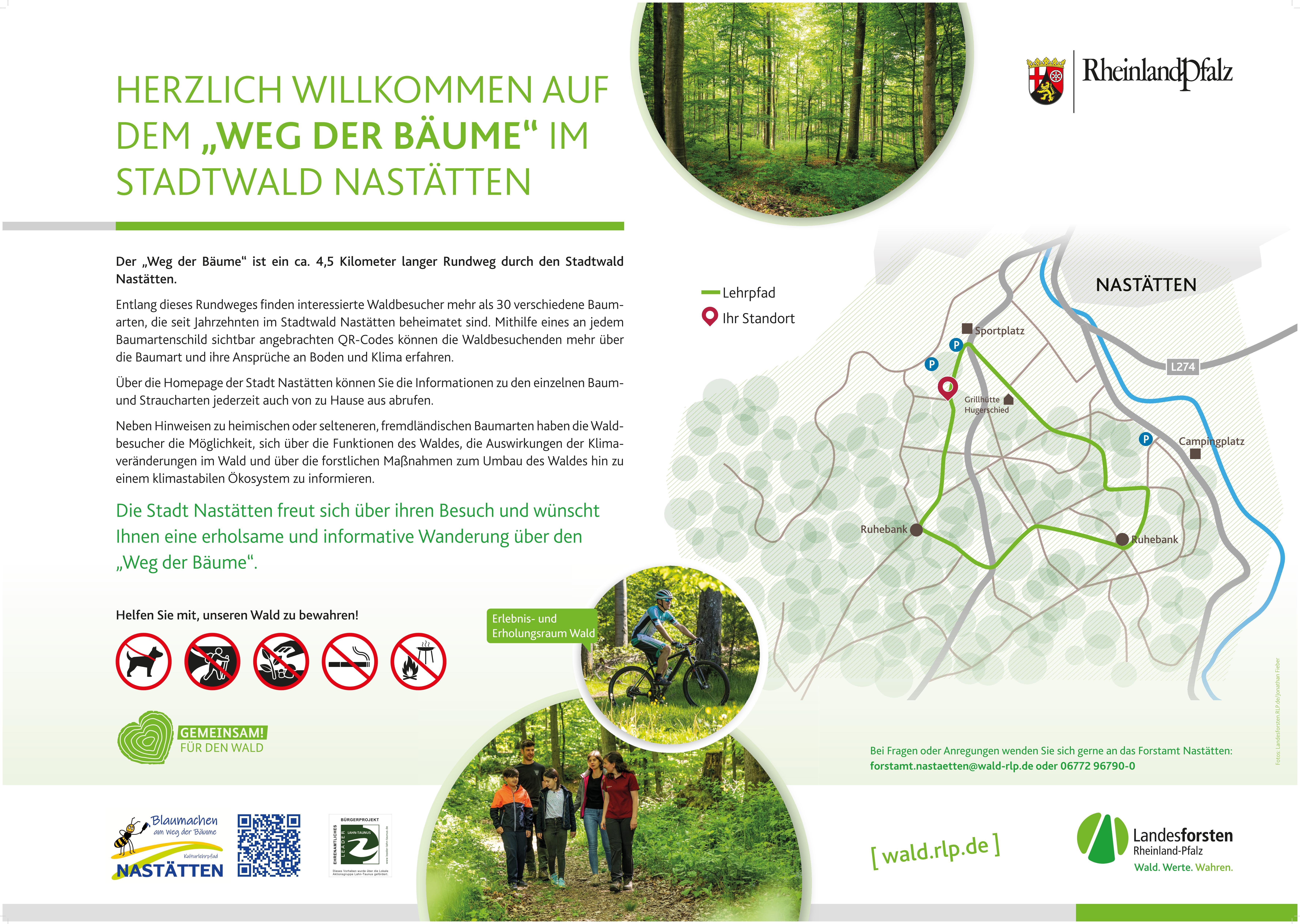 Der „Weg der Bäume“ ist ein ca. 4,5 Kilometer langer Rundweg durch den Stadtwald Nastätten. Entlang dieses Rundweges finden interessierte Waldbesucher mehr als 30 verschiedene Baumarten, die seit Jahrzehnten im Stadtwald Nastätten beheimatet sind. Mithilfe der nun neuen an jedem Baumartenschild sichtbar angebrachten QR-Codes können die Waldbesuchenden mehr über die Baumart und ihre Ansprüche an Boden und Klima erfahren.